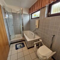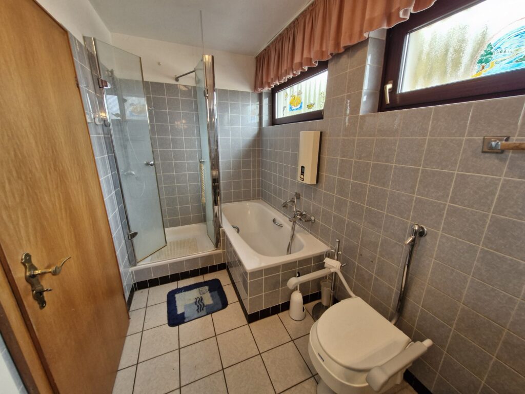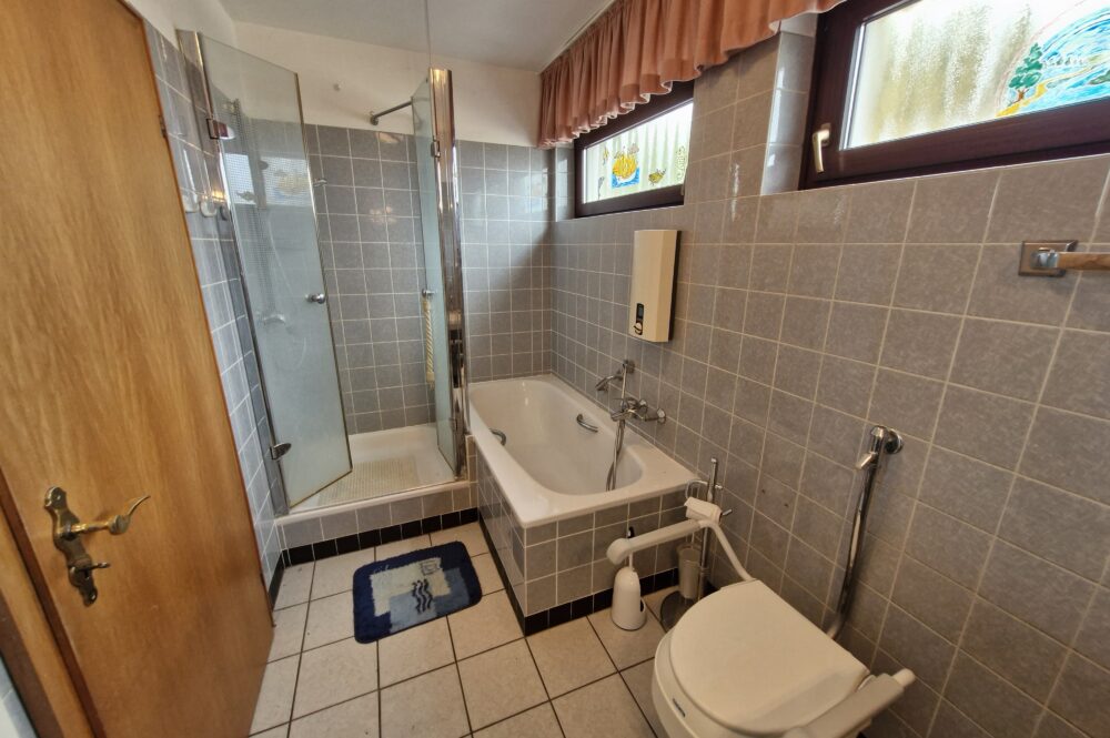 • Tageslichtbadezimmer mit Badewanne, Dusche, Waschbecken, WC im Obergeschoß