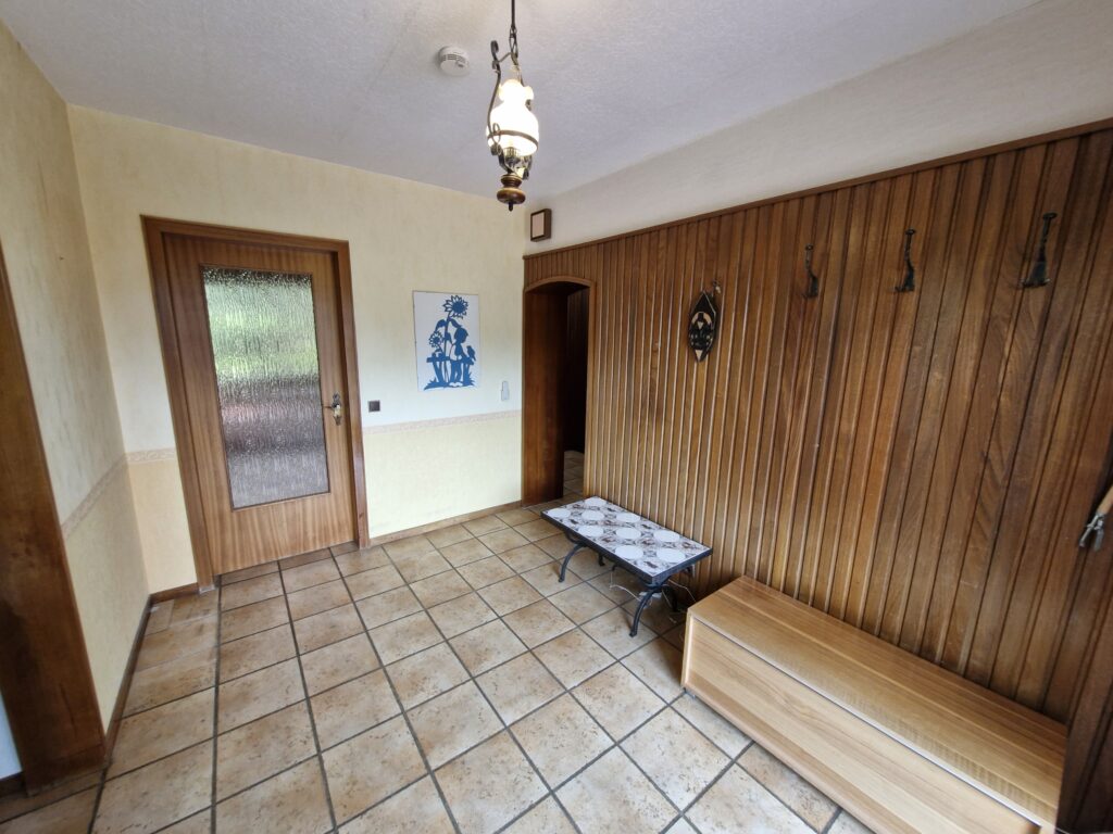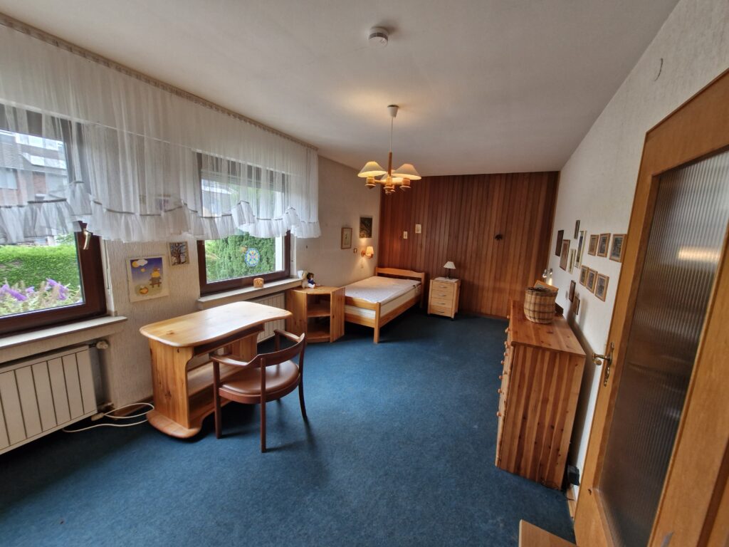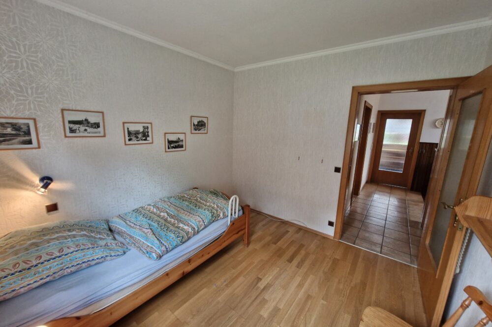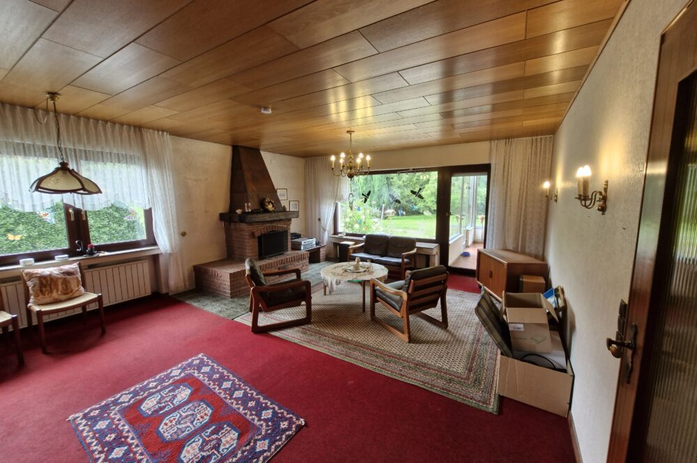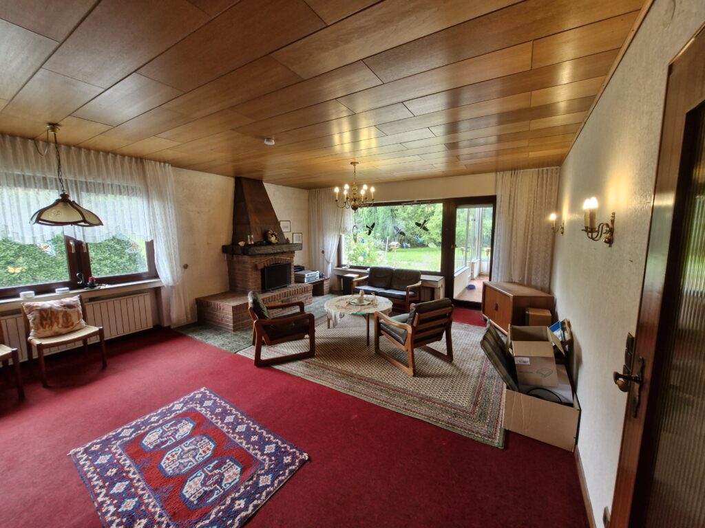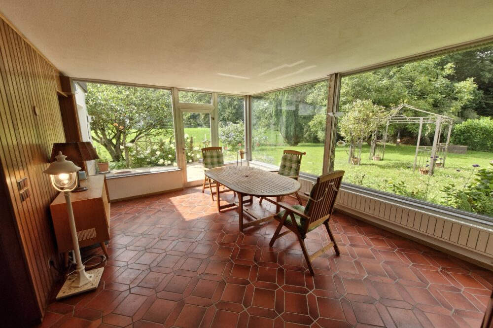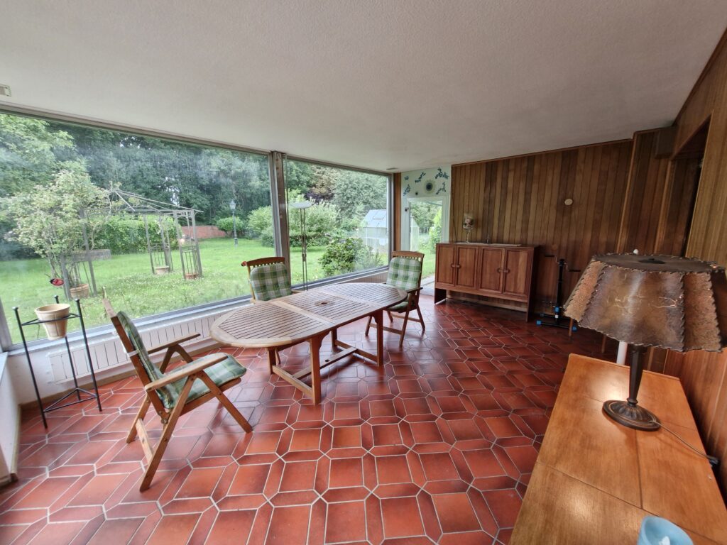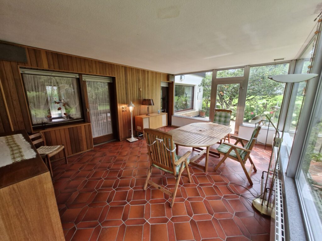 Das Einfamilienhaus wurde im Jahre 1967 in Massivbauweise fertiggestellt. Die Wohnfläche von rund 138 m² verteilt sich auf die Diele, das Gäste-WC, das Wohnzimmer, den beheizten Wintergarten, welcher als Esszimmer dient, und die Küche im Erdgeschoss. Im Obergeschoss befinden sich drei weitere Zimmer, sowie das Tageslichtbadezimmer mit Dusche und Badewanne.