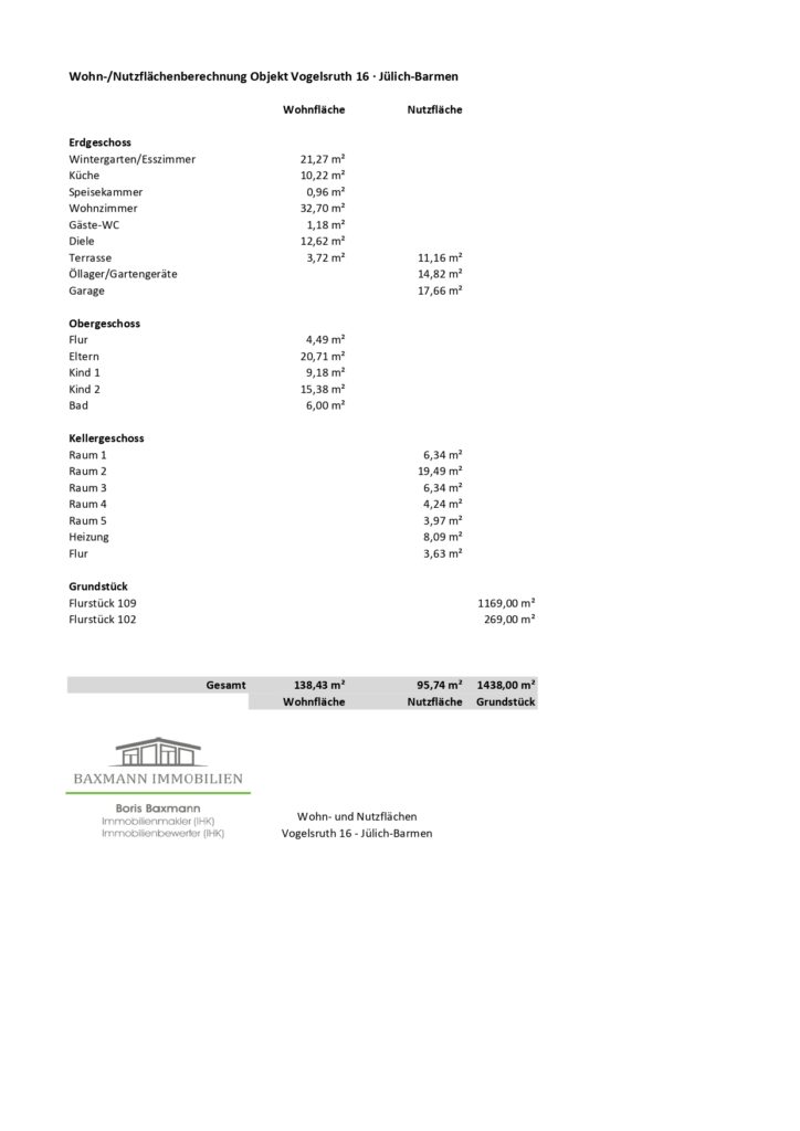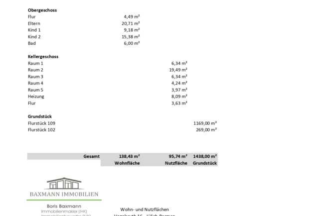 | Sonstiges:: | Die Immobilie kann von den neuen Eigentümern kurzfristig übernommen werden. Die in diesem Exposé und etwaigen Anlagen und Plänen enthaltenen Angaben und Objektbeschreibungen beruhen ausschließlich auf Angaben des Eigentümers bzw. Auftraggebers oder sonstiger Dritter. Die Firma Baxmann Immobilien hat deren sachliche Richtigkeit und Vollständigkeit nicht überprüft. Für die Richtigkeit und Vollständigkeit der Angaben übernimmt die Firma Baxmann Immobilien daher keine Haftung. Wir dürfen Sie bitten, Fragen zum Objekt oder Anfragen zu Besichtigungsterminen ausschließlich über das Kontaktformular zu stellen. Wir werden Ihnen dann gerne einen Besichtigungstermin anbieten. |